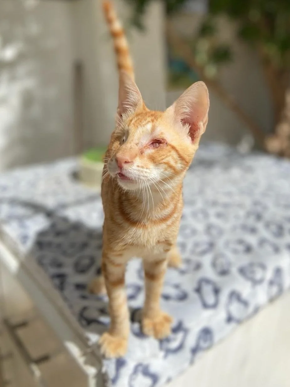 One of the biggest challenges in Dahab is Herpes Viral Conjunctivitis, a condition that often affects kittens, typically passed down from their mothers. The symptoms can be severe, and if left untreated, the kittens can lose vision in one or both eyes. Poppy came to us with serious eye problems and an upper respiratory infection, and despite the best efforts of our volunteers and veterinarians, he lost both of his eyes.